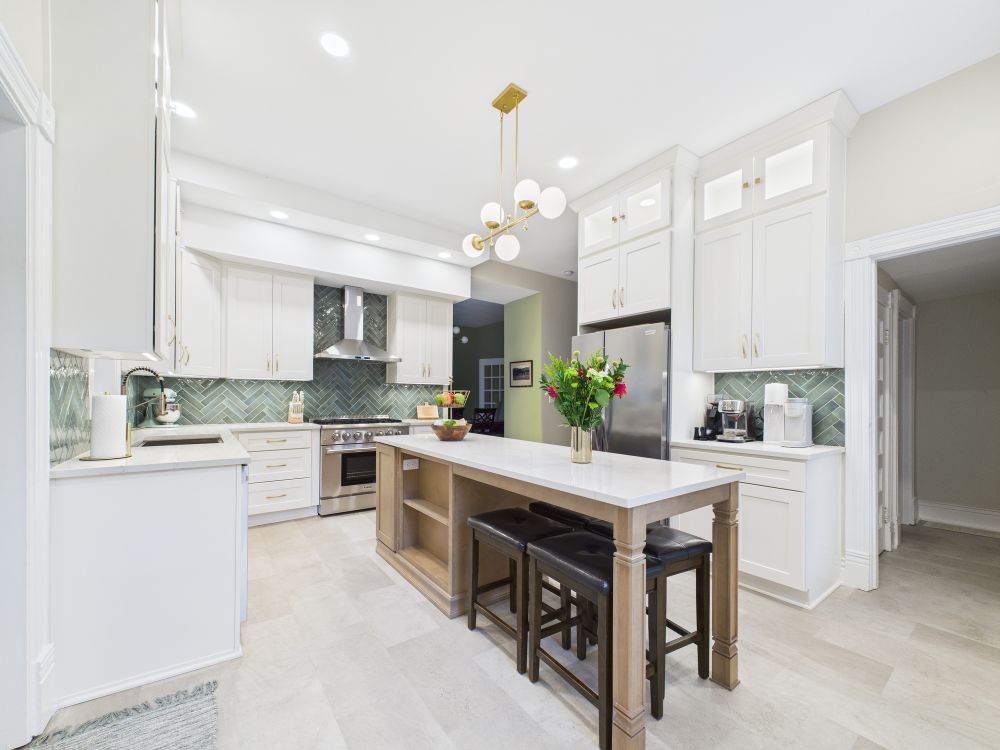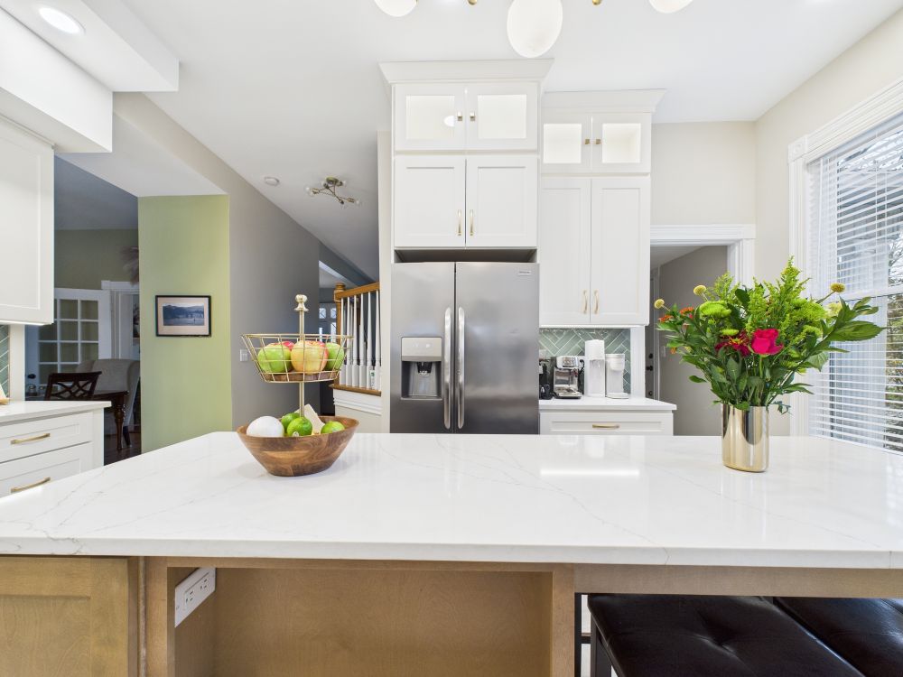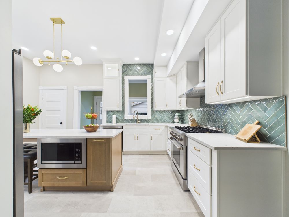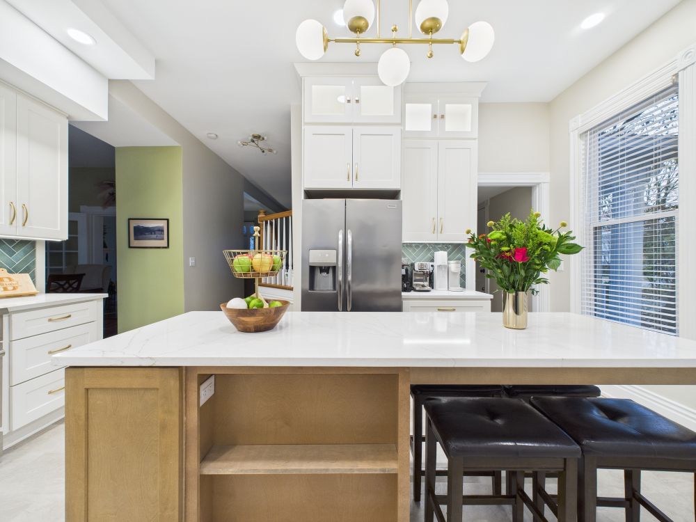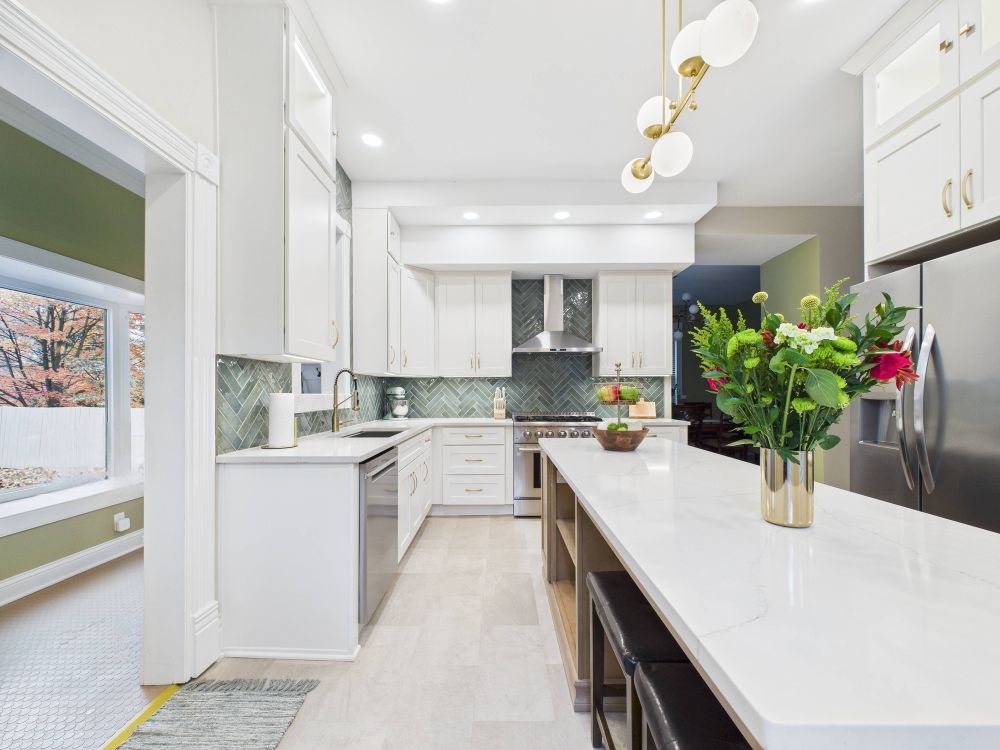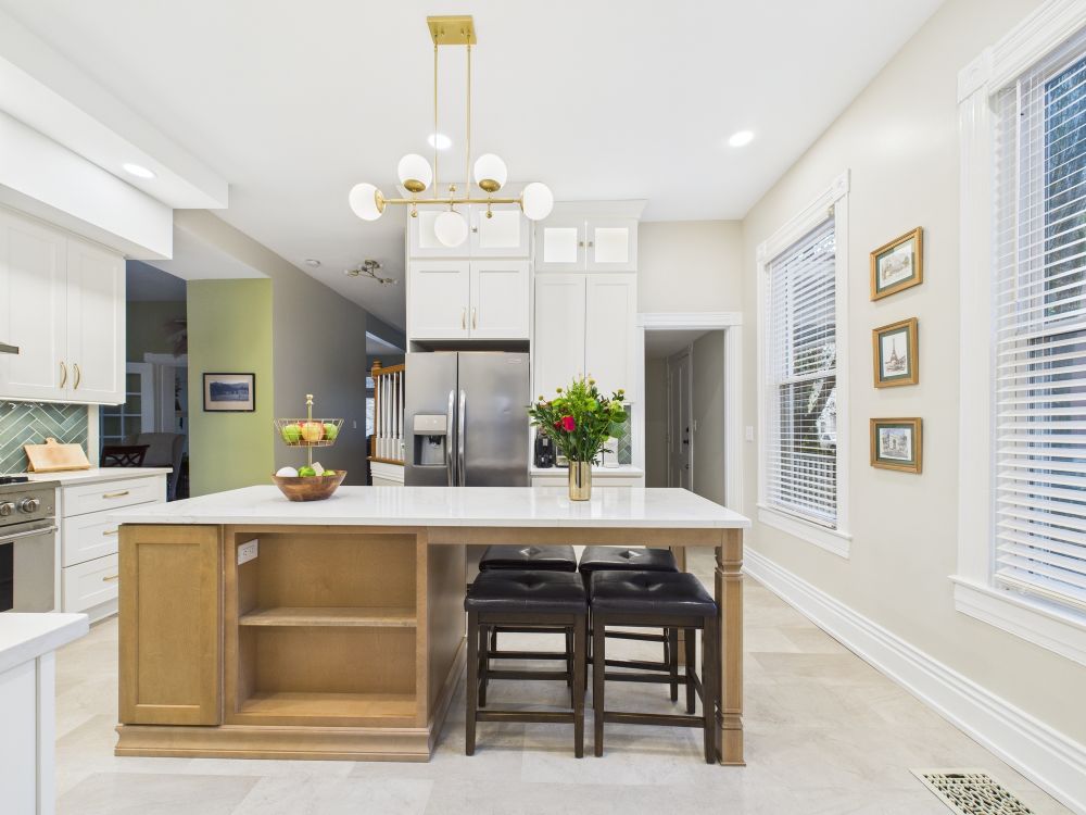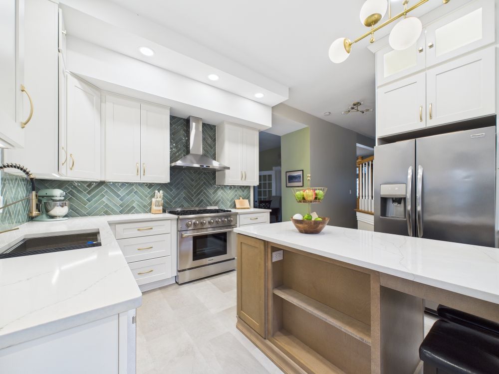 This kitchen remodel features white cabinets, a large center island, modern lighting, light surfaces, and a streamlined layout that improves storage and workflow while creating a brighter, more open space for daily meals and family gathering.