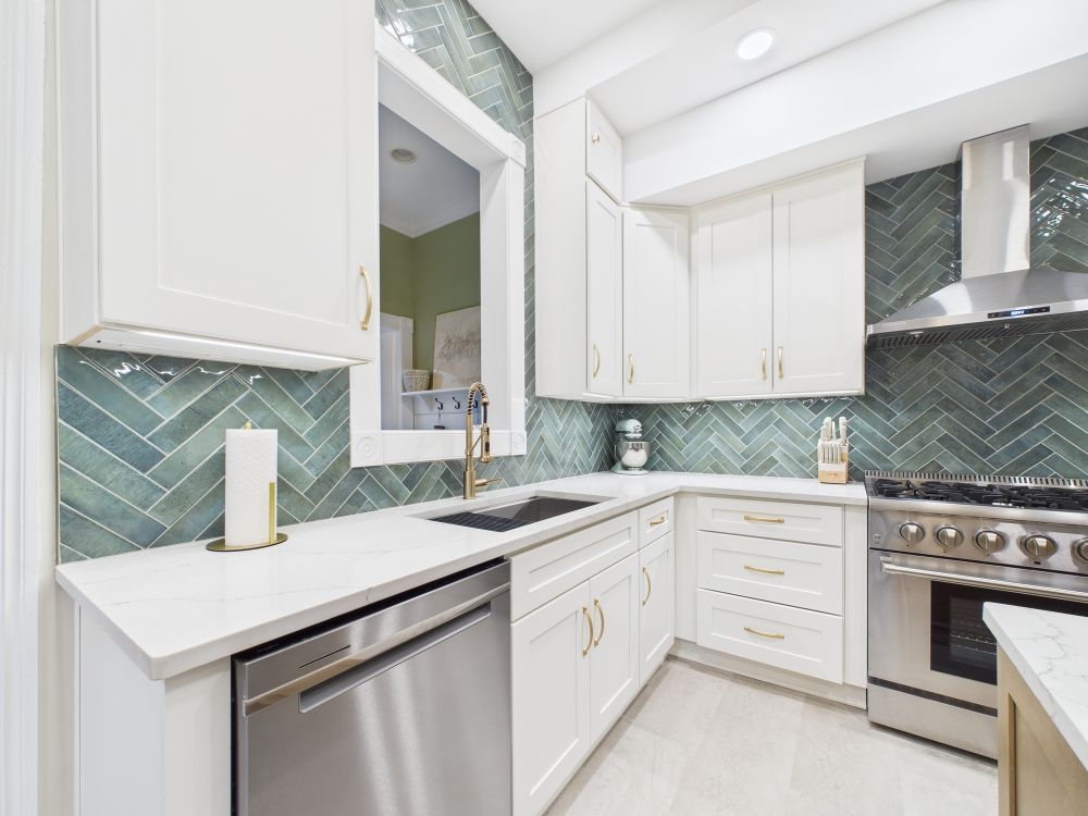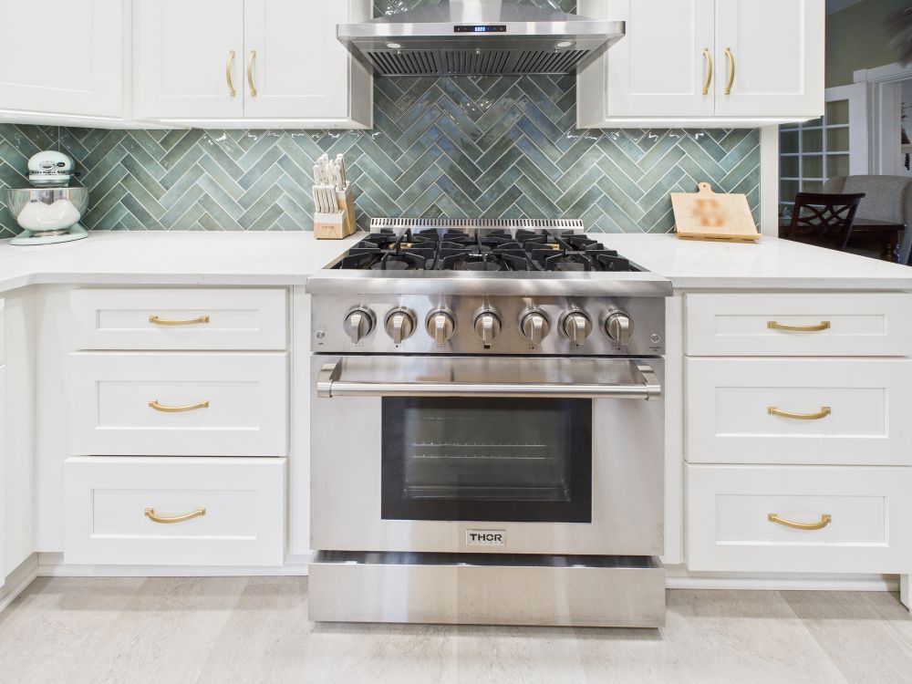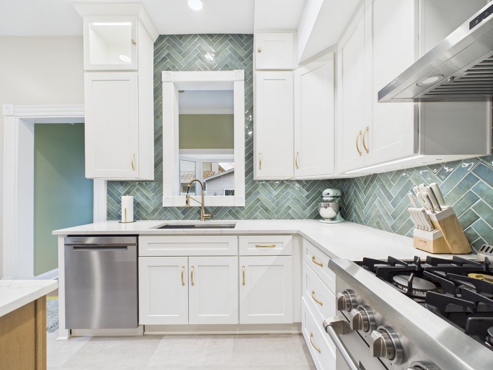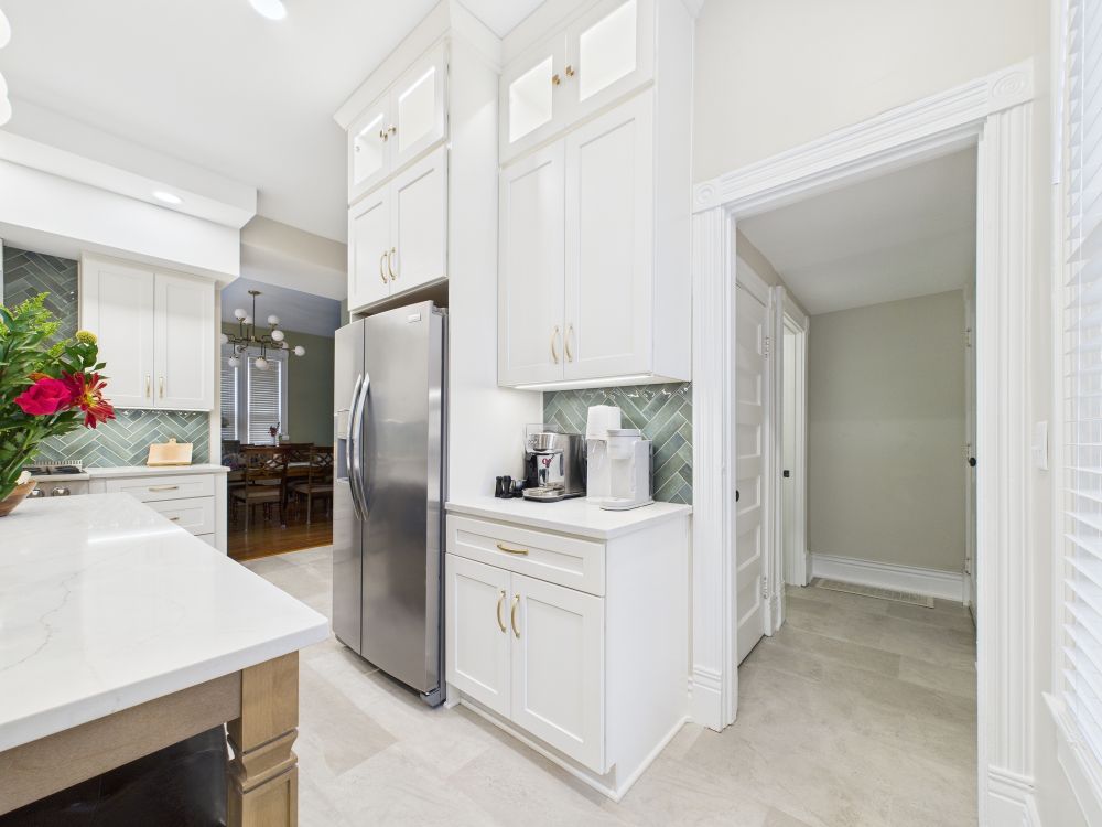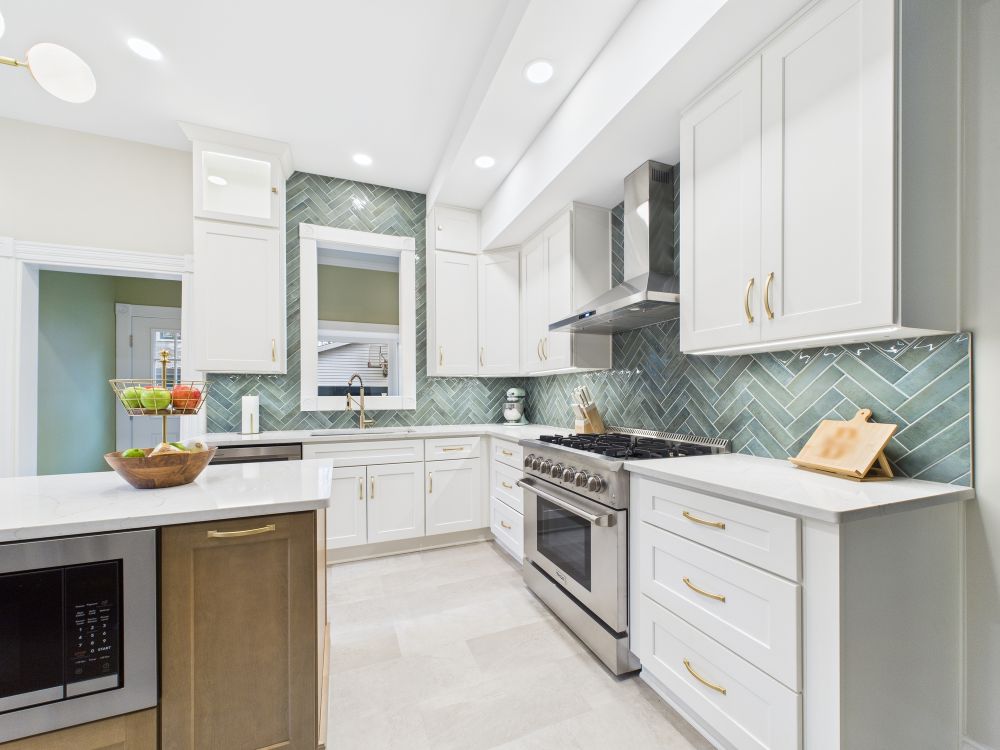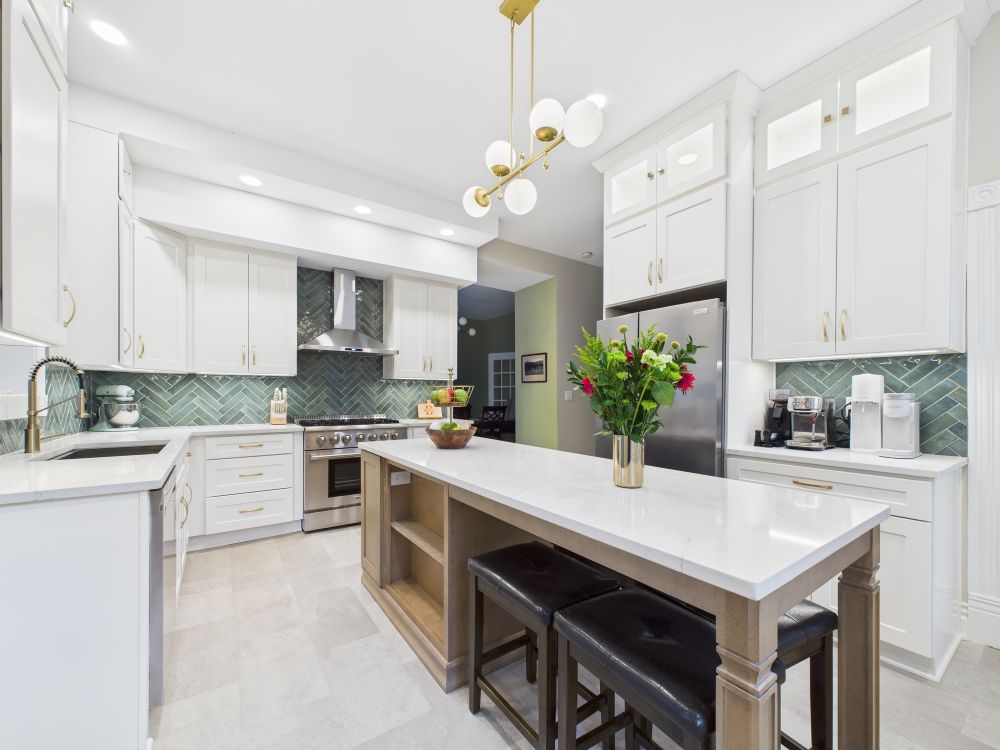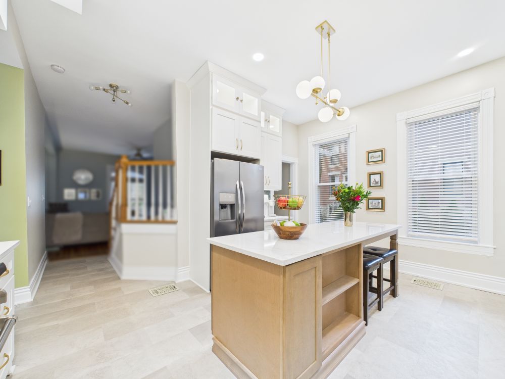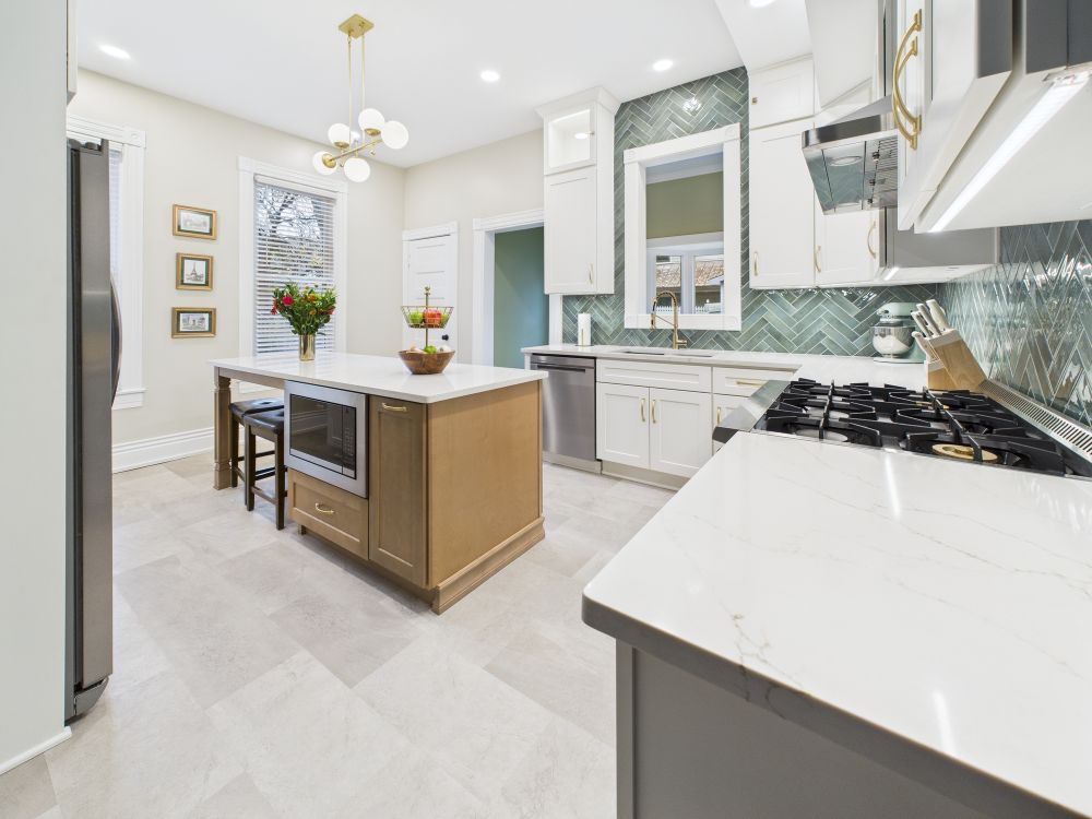 This kitchen remodel features white cabinets, a large center island, modern lighting, light surfaces, and a streamlined layout that improves storage and workflow while creating a brighter, more open space for daily meals and family gathering.